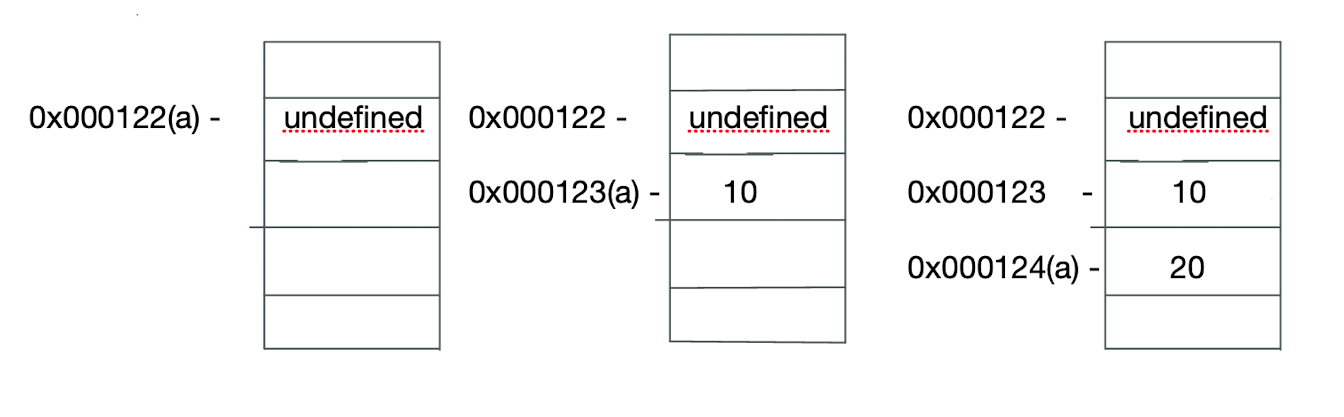 호이스팅에서 설명하였듯이 변수는 선언될때 암묵적으로 undefined라는 값이 할당됩니다, 여기서 10이라는 메모리 주소로 참조가 변경된거고 20이라는 또 새로운 주소로 참조가 변경된 것 입니다.