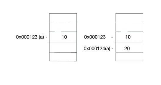 위와 같이 기존 10이라는 값을 가지고 있는 메모리 주소에서 20을 가지고 있는 새로운 메모리 공간을 만든뒤 a 식별자의 주소를 해당 메모리 주소로 참조를 변경합니다.