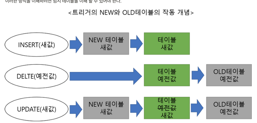 DELECT와 UPDATE는 OLD라는 값을 가지고 있는데 해당 값은 중간에 테이블을 예전값을 지우고 나서 지워진 데이터를 OLD 테이블에 저장한다.