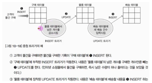 이처럼 다중 트리거는 하나의 트리거의 여러개의 트리거가 계속해서 동작되는 트리거를 MYSQL에서는 다중 트리거, 중첩 트리거라고 한다.