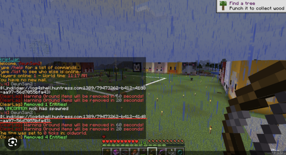 위 사진과 같이 Minecraft에서는 채팅 내역등을 log4j 프레임워크로 기록하고 있었기 때문에 위 사진과 같이 log4shell 페이로드를 보내게 된다면 RCE 공격이 실제로 발생하는 것을 확인해볼 수 있습니다.