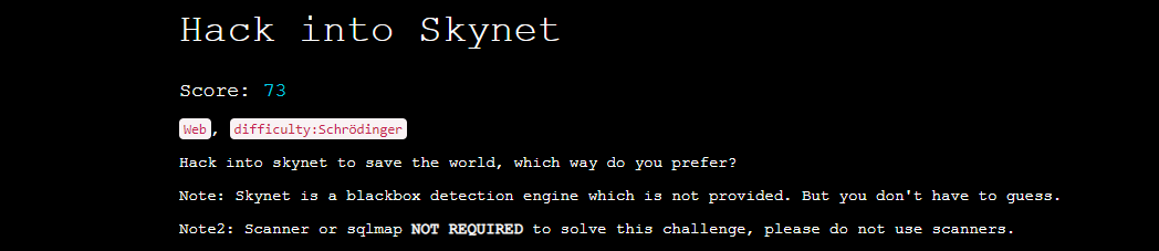 하지만 Web Hacking과 관련된 문제도 있었기에 그중 가장 포인트가 낮은 문제인 Hack into Skynet이라는 문제를 풀어보기 시작하였습니다.