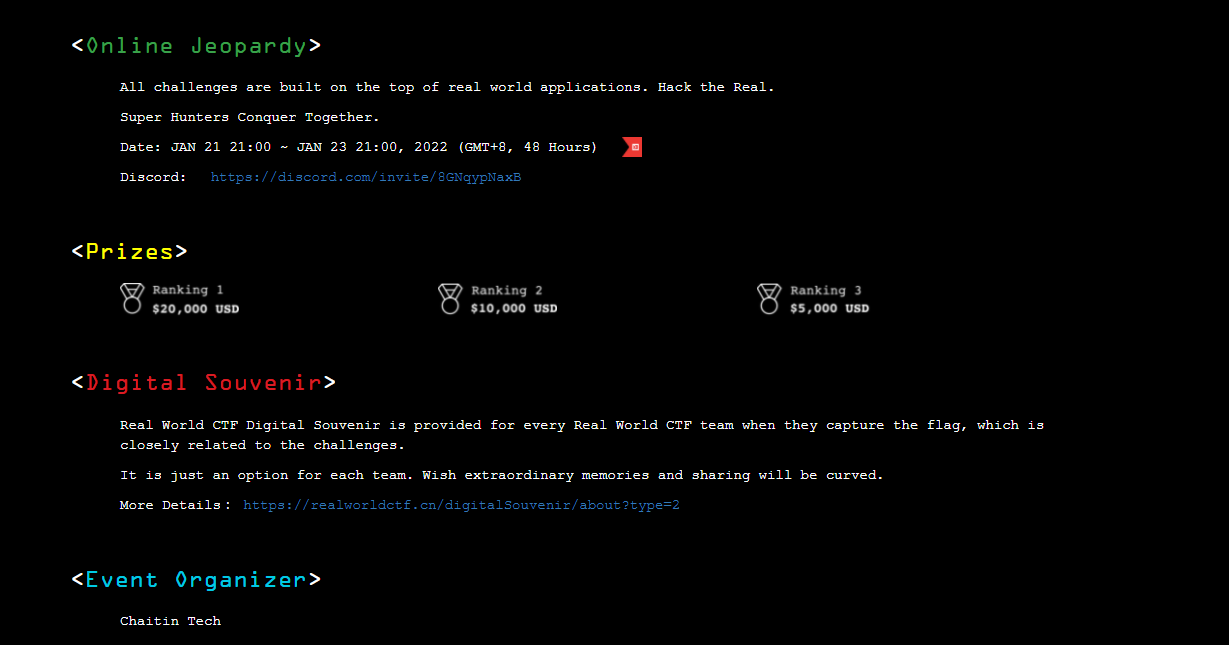 2022년 1월 21년 오후 10시에 REALWORLD CTF 사이트에 들어가 봤습니다, 사이트에는 대회의 시작을 알리는 카운트다운 타이머가 존재하였는데 오후 10시가 되자 카운트 다운이 0을 가리켰습니다.