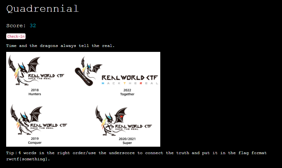 이 문제에서 시간과 용은 항상 진실만을 말한다라는 내용과 함께 올바른 4 단어를 언더스코어로 조합해서 FLAG를 획득하라고 나와 있었습니다.